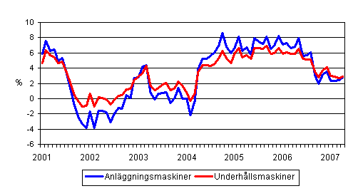 Kostnaderna för anläggningsmaskiner ökade med 2,9 procent från april år 2006 till april år 2007. Kostnaderna för underhållsmaskiner ökade med 2,9 procent och kostnaderna för de traditionella anläggningsmaskinerna med 2,8 procent. Kostnaderna för mobilkranar gick upp med 3,4 procent.