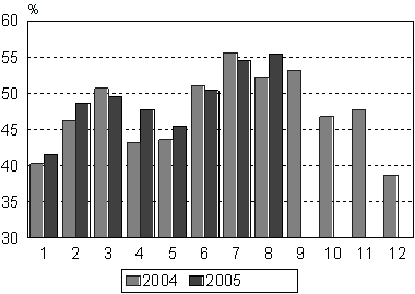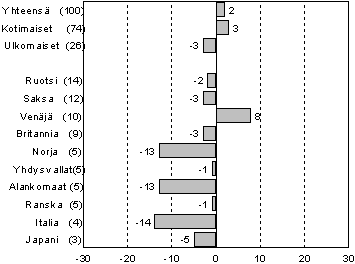 Venäjää lukuun ottamatta Suomeen suuntautuva matkailu väheni kaikista tärkeimmistä matkailijamaista kesällä 2005. Venäläisten yöpymiset lisääntyivät Suomen majoitusliikkeissä 8 prosenttia. Sitä vastoin Italialaisten yöpymiset vähenivät 14 prosenttia ja norjalaisten sekä hollantilaisten yöpymiset 13 prosenttia vuodentakaisesta. Myös japanilaisten yöpymisiä kirjattiin Suomen majoitusliikkeissä 5 prosenttia viimevuotista vähemmän.