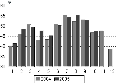 Suomen majoitusliikkeissä yövyttiin 15 miljoonaa kertaa tammi-lokakuussa 2005. Määrä oli 3 prosenttia suurempi kuin vuoden 2004 vastaavana ajanjaksona. Kotimaisten matkailijoiden yöpymiset lisääntyivät vajaat 4 prosenttia ja ulkomaisten matkailijoiden yöpymisiä kirjattiin lähes 2 prosenttia enemmän kuin vuotta aiemmin. Yöpymisten määrä kasvoi eniten Kainuussa, 11,7 prosenttia ja Keski-Pohjanmaalla, 11,1 prosenttia.