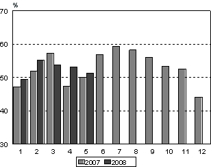 Venäläiset olivat suurin ulkomaisten matkailijoiden ryhmä toukokuussa 2008. Heidän yöpymisiään kirjattiin Suomen majoitusliikkeissä 51 000 vuorokautta. Määrä oli peräti 50,5 prosenttia enemmän kuin vuotta aiemmin. Ruotsalaiset olivat seuraavana 48 000 yöpymisvuorokaudellaan, vaikka vähennystä olikin 6 prosenttia viime vuodesta. Saksalaiset olivat kolmantena ja he yöpyivät majoitusliikkeissä 40 000 kertaa, mikä oli 7,5 prosenttia enemmän kuin toukokuussa 2007. Italialaisten yöpymiset lisääntyivät 18 prosenttia ja ranskalaisten sekä yhdysvaltalaisten yöpymisiä tilastoitiin 7 prosenttia enemmän kuin vuotta aiemmin. Sitä vastoin virolaisten yöpymiset vähenivät 12,5 prosenttia viime vuodesta. Kaikkiaan ulkomaisten matkailijoiden yöpymisiä tilastoitiin 364 000 vuorokautta toukokuussa 2008.