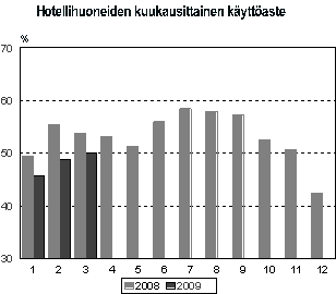 Matkailijoiden yöpymiset Suomen majoitusliikkeissä vähenivät 8 prosenttia maaliskuussa 2009 vuodentakaiseen verrattuna. Ulkomaisten matkailijoiden yöpymiset vähenivät 15 prosenttia ja kotimaisten matkailijoiden yöpymiset 5 prosenttia. Yöpymisvuorokausien kokonaismäärä jäi vajaaseen 1,5 miljoonaan, josta 76 prosenttia eli 1,1 miljoonaa oli kotimaisten matkailijoiden yöpymisiä. Loput 360 000 oli ulkomaisten matkailijoiden yöpymisiä. Luvut ovat Tilastokeskuksen majoitustilaston ennakkotietoja ja ne on kerätty majoitusliikkeiltä, joissa on vähintään 10 huonetta, mökkiä tai sähköpistokkeella varustettua matkailuvaunupaikkaa sekä retkeilymajoilta.
