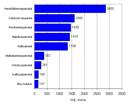 Matkailukysynnän suurimman erän muodostavat henkilöliikennepalvelut, joita käytettiin lähes 2,9 miljardilla eurolla. Ravitsemispalveluja kulutettiin vajaalla 1,5 miljardilla eurolla ja majoituspalveluja 1,4 miljardilla eurolla. Polttoaineet ja ostokset kaupasta kuuluivat myös tärkeimpiin matkailijoiden kulutusmenoeriin.