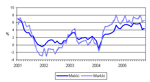 Metsäalan konekustannusindeksin ja maarakennusalan konekustannusindeksin vuosimuutokset 1/2001 - 11/2005