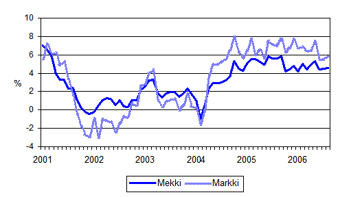 Årsförändringarna av kostnadsindex för skogsmaskiner (Mekki) och kostnadsindex för anläggningsmaskiner (Markki) 1/2001 - 8/2006