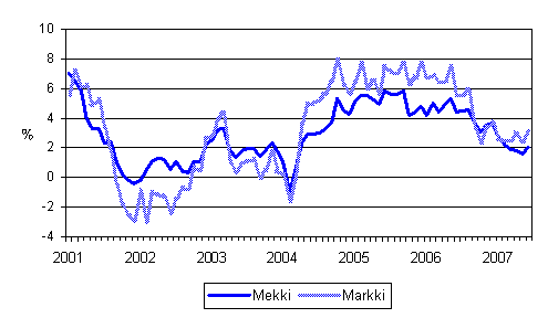 Årsförändringarna av kostnadsindex för skogsmaskiner (Mekki) och kostnadsindex för anläggningsmaskiner (Markki) 1/2001 - 6/2007
