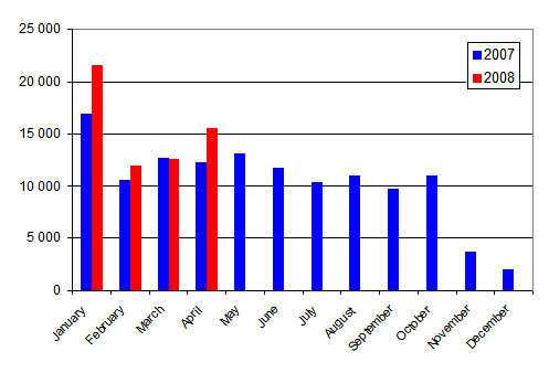 In the January to April period of 2008 a total of 100,232 vehicles were first registered. Compared to the year before, there was a increase of 8.1 per cent. The number of passenger cars first registered in the January to April period was 61,631, which is 17.4 per cent up from the year before. The most common passenger car makes first registered in the January to April period were Toyota, Volkswagen and Volvo.