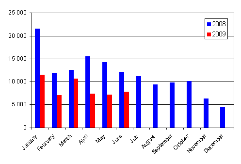 In the January to June period of 2009 a total of 100,816 vehicles were first registered. Compared to the year before, there was a decrease of 34.6 per cent. The number of passenger cars first registered in the January to June period was 52,067, which is 40.9 per cent down from the year before. The most common passenger car makes first registered in the January to June were Toyota, Volkswagen and Ford.
