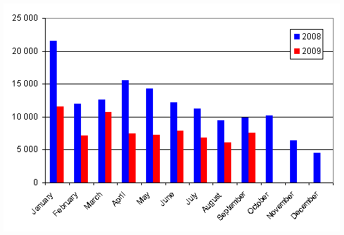 In the January to September period of 2009 a total of 141,778 vehicles were first registered. Compared to the year before, there was a decrease of 32.7 per cent. The number of passenger cars first registered in the January to September period was 72,593, which is 38.8 per cent down from the year before. The most common passenger car makes first registered in the January to September were Toyota, Volkswagen and Ford.