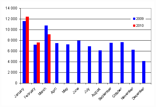 In the January to March period of 2010 a total of 44,242 vehicles were first registered. Compared to the year before, there was a decrease of 7.6 per cent. The number of passenger cars first registered in the January to March period was 29,084, which is 1.4 per cent down from the year before. The most common passenger car makes first registered in the January to March were Volkswagen, Toyota and Ford.