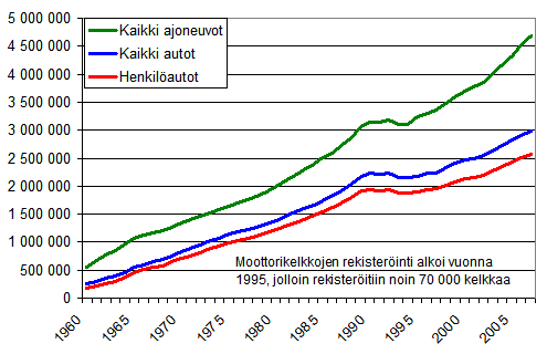 Vuoden 2007 lopussa rekisterissä oli 2 570 356 henkilöautoa. Henkilöautokanta kasvoi vuoden 2007 aikana 2,6 %. Henkilöautojen määrän kasvu oli suurinta Kanta-Hämeen (3,9 %) ja pienintä Uudenmaan ja Keski-Pohjanmaan (2,0 %) maakunnissa. Suhteellisesti eniten vuonna 2007 koko maassa kasvoivat rekisteröityjen mopojen (13,4 %) ja moottoripyörien (9,2 %) määrät. Moottorityökoneiden, traktoreiden, moottorikelkkojen ja perävaunujen määrän suhteellinen kasvu jäi alle 5 prosentin.