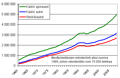 Ajoneuvorekisterissä oli vuoden 2008 päättyessä 4 950 760 ajoneuvoa, joista autoja oli 3 150 296. Autojen osuus rekisteröidyistä ajoneuvoista oli 64,0 %. Ajoneuvojen kokonaismäärä kasvoi 5,6 % ja autojen määrä 5,4 % vuoden 2007 lopun tilanteeseen verrattuna. Tiedot perustuvat Ajoneuvohallintokeskuksen ajoneuvoliikennerekisteriin sekä Ålands Motorfordonsbyrån ajoneuvorekisteriin ja ne on tuottanut Tilastokeskus. Ahvenanmaan rekisterissä oli vuoden 2008 lopussa noin 35 000 ajoneuvoa.
