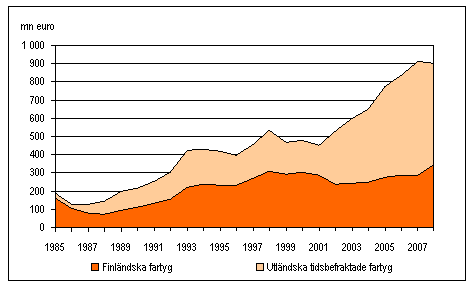 År 2008 var de tidsbefraktade utländska fartygens bruttoinkomster av utländsk sjöfart 981 miljoner euro, vilket är 12 miljoner euro mindre än året innan. Andelen tidsbefraktade utländska fartyg var 44 procent av samtliga fartygs bruttoinkomster.