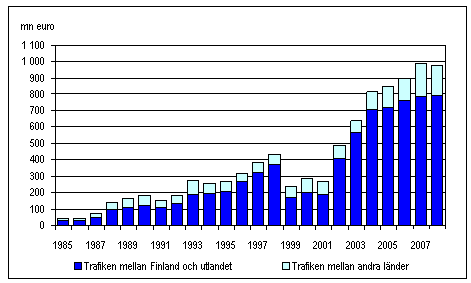 Av de tidsbefraktade utländska fartygens inkomster härrörde 80 procent, dvs. 789 miljoner euro, från trafiken mellan Finland och utlandet. Inkomsterna av trafiken mellan andra länder uppgick till 192 miljoner euro.