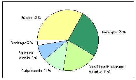 Den tredje största enskilda utgiftsposten var kostnaderna för anskaffningar för restauranger och butiker. De uppgick till 65 miljoner euro, vilket är omkring 17 miljoner euro mindre än föregående år. De övriga kostnaderna till utlandet, bl.a. reparationskostnader och försäkringspremier, uppgick totalt till 78 miljoner euro för de finländska fartygens del.
