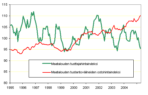 Maatalouden hintaindeksien 2000=100 kehitys 1995 - 2005