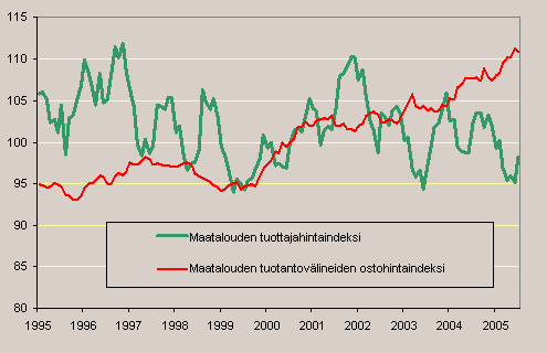 Maatalouden hintaindeksien 2000=100 kehitys 1995 - 2005