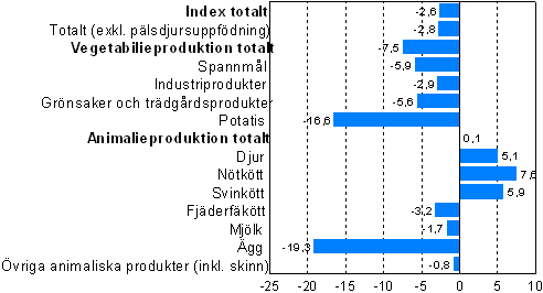 Prisindexet för vegetabilieproduktionen sjönk med nästan sju procent på årsnivå. Prisindexet för animalieproduktionen steg med 2,7 procent, men sjönk med 2,2 procent exkl. pälsskinn. På nedgången av totalindexet inverkade särskilt billigare potatis, grönsaker och trädgårdsprodukter. Priset på matpotatis var drygt trettio procent lägre och äggprisen drygt tio procent lägre under det första kvartalet jämfört med året innan. Priset på pälsskinn steg med 30,5 procent. Indexnedgången dämpades av att priset på nötkött gick upp med 5,0 procent.