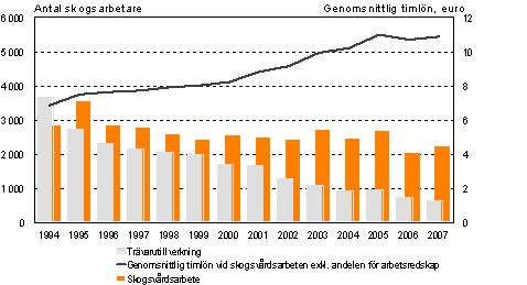 Under det andra kvartalet år 2007 fanns det 2 310 skogsarbetare. 2 240 skogsarbetare hade utfört skogsvårdsarbeten. Deras genomsnittliga timlön var 10,88 euro, exkl. andelen för arbetsredskap. Ökningen från motsvarande kvartal året innan var 1,9 procent. 642 skogsarbetare hade arbetat inom trävarutillverkning. Deras genomsnittliga timlön var 12,06 euro, exkl. andelen för arbetsredskap. Ökningen från motsvarande kvartal året innan var 2,8 procent. 666 skogsarbetare hade utfört andra skogsarbeten. Deras genomsnittliga timlön var 10,51 euro, exkl. andelen för arbetsredskap. Minskningen från motsvarande kvartal året innan var 0,8 procent.
