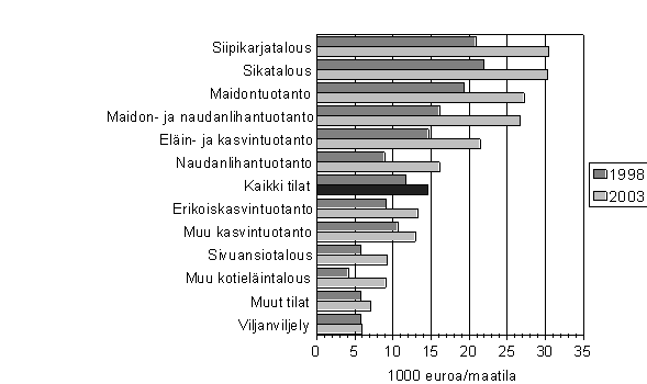 Siipikarja- ja sikatilat olivat maatalouden tuloksella mitattuna kärjessä vuonna 2003 tuotantosuuntien välisessä vertailussa. Vuodesta 1998 vuoteen 2003 kaikkien maatilojen keskimääräinen tulos kohosi nimellisesti noin 25 prosenttia. Kun tuotantonsa lopettaneet tilat jätetään tarkastelun ulkopuolelle, niin jäljelle jääneiden maatilojen tulos kasvoi vastaavalla ajanjaksolla 12 prosenttia. Tiedot käyvät ilmi Tilastokeskuksen julkaisemasta Maatilatalouden yritys- ja tulotilasto 2003:sta.