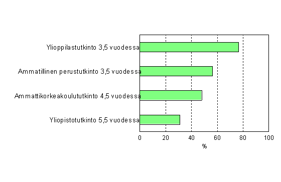 Yliopistoista valmistui viidessä ja puolessa vuodessa 31 % viiden vuoden takaisesta 18 300 uudesta opiskelijasta. Yliopisto-opintoja jatkoi 58 % ja noin 10 % oli muualla opiskelemassa, työssä, työttömänä tai muussa toiminnassa. Nopeimmin valmistuttiin sosiaali-, terveys- ja liikunta-alalta, noin 49 % oli valmistunut. Tarkasteluaikana vähiten valmistuneita oli tekniikan ja liikenteen alalla, 17 %.