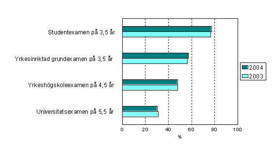I slutet av år 2004 hade 77 procent av de 37 000 gymnasister som påbörjat sina studier tre år tidigare avlagt studentexamen, medan 14 procent fortfarande bedrev gymnasiestudier. Av de omkring 48 000 studerande som påbörjat utbildningen för en yrkesinriktad grundexamen hade 57 procent utexaminerats under referensperioden, omkring 18 procent fortsatte sina studier och drygt 20 procent arbetade, var arbetslösa eller verksamma med något annat. Utexamineringen hade blivit en aning snabbare jämfört med året innan.