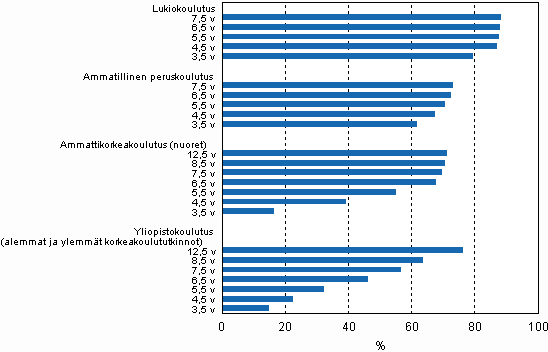 Tilastokeskuksen mukaan vuoden 2001 uusista lukio-opiskelijoista lähes 90 prosenttia oli suorittanut ylioppilastutkinnon vuoden 2007 loppuun mennessä. Samassa ajassa ammatillisen peruskoulutuksen uusista opiskelijoista 73 prosenttia suoritti ammatillisen tutkinnon. Ammattikorkeakoulututkinnon suoritti vuoden 2007 loppuun mennessä 71 prosenttia 12,5 vuoden takaisista ammattikorkeakoulujen uusista opiskelijoista. Samassa ajassa yliopistojen uusista opiskelijoista 77 prosenttia suoritti ylemmän tai alemman korkeakoulututkinnon.