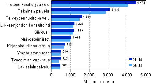 Liikevaihto eräillä liike-elämän palvelujen toimialoilla 2004