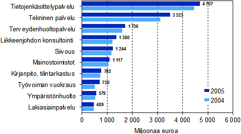 Tilastokeskuksen mukaan vuosi 2005 oli liike-elämän palvelujen alalla toinen peräkkäinen voimakkaan kasvun vuosi. Yrityksiä toimi 2 400 enemmän kuin edellisenä vuonna, kaikkiaan 51 200. Liikevaihtoa yrityksille kertyi 18,9 miljardia euroa, kasvuprosentin ollessa 7,7. Toimiala työllisti 198 100 henkilöä, mikä oli 6,4 prosenttia edellisvuotista enemmän. Liiketulos kasvoi vuotta aiemmasta 200 miljoonalla eurolla ja oli 7,9 prosenttia liiketoiminnan tuotoista. Voittoa kertyi 2,1 miljardia euroa, 11 prosenttia tuotoista. Pk-sektori kattoi alan yritysten lukumäärästä 99 prosenttia, liikevaihdosta 61 ja henkilöstön lukumäärästä 60 prosenttia.