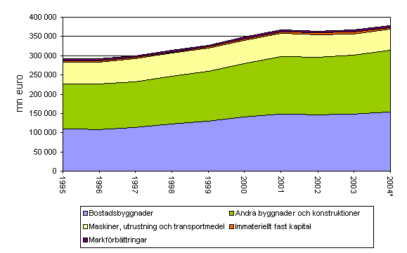 Enligt Statistikcentralens reviderade kapitalstocksserier var värdet på samhällsekonomins nettokapitalstock 378 miljarder euro år 2004, dvs. 3,2 procentenheter högre än året innan. Bostadsbyggnadernas andel av nettostocken var 40,7 procent och de övriga husbyggnadernas samt anläggningsverksamhetens andel 42,1 procent. Maskiner, apparater, utrustning och transportmedel utgjorde 14,5 procent och det immateriella fasta kapitalet samt ombyggnaderna 2,7 procent av det fasta kapitalet i samhällsekonomin.