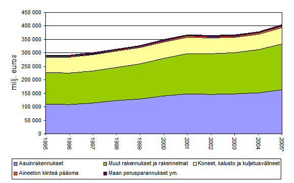 Kansantalouden kiinteän pääoman nettokanta kasvoi Tilastokeskuksen tarkistettujen tietojen mukaan 1,4 prosenttia vuonna 2005. Nimellisesti pääomakanta kasvoi 6,7 prosenttiyksikköä edellisestä vuodesta. Pääomakannan arvo oli 404 miljardia euroa. Asuinrakennusten osuus pääomakannasta oli 40,4 prosenttia ja muiden talonrakennusten sekä maa- ja vesirakennusten osuus 42 prosenttia. Koneet, laitteet, kalusto ja kuljetusvälineet muodostivat 15 prosenttia ja aineeton kiinteä pääoma sekä maan perusparannukset 2,6 prosenttia kansantalouden kiinteästä pääomasta.