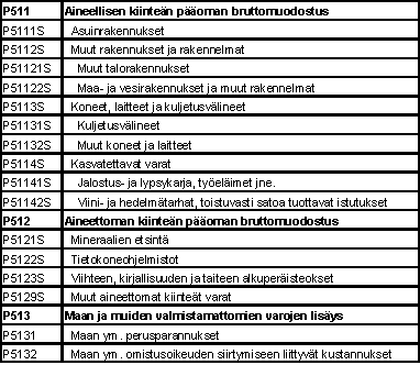 "Kiinteän pääoman bruttomuodostus (P51) koostuu kotimaisten tuottajien kiinteiden varojen hankinnoista tiettynä ajanjaksona, vähennettynä luovutuksilla, plus eräistä tuottajan tai institutionaalisen yksikön tuotantotoiminnan aiheuttamista lisäyksistä valmistamattomien varojen arvoon. Kiinteät varat ovat tuotantoprosessien tuotoksina tuotettuja aineellisia tai aineettomia varoja, joita itseään käytetään toistuvasti tai jatkuvasti tuotantoprosesseissa pitempään kuin yhden vuoden ajan." (EKT95, 3.102)
