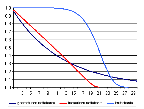 missä d = R/E kuitenkin niin, että jäljelle jäävän pääomatavaran arvo nollataan siinä vaiheessa kun saavutetaan 1,5 kertaa elinikä. R on 1,65 koneille, laitteille ja kuljetusvälineille sekä 2 aineettomille pääomatavaroille. E on elinikä.
