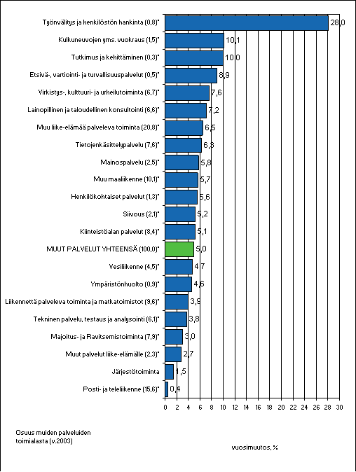 Kaikki palvelualojen alatoimialat kasvattivat liikevaihtoaan vuoden 2004 viimeisellä vuosineljänneksellä. Voimakkaimmin kasvoi työnvälitys ja henkilöstön hankinta, 28 prosenttia. Kulkuneuvojen yms. vuokraus kasvoi 10,1 prosenttia ja tutkimuksen ja kehittämisen toimiala 10 prosenttia. Hitainta kasvu oli posti- ja teleliikenteessä, 0,4 prosenttia sekä järjestötoiminnassa 1,5 prosenttia.