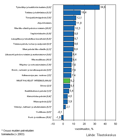 Palvelualojen liikevaihdon kasvu oli nopeinta kolmannella neljänneksellä työnvälityksen ja henkilöstön hankinnan toimialalla, joka kasvoi viime vuoden vastaavasta ajasta 34,6 prosenttia. Tutkimuksen ja kehittämisen toimialan liikevaihto kasvoi tuoreimmalla neljänneksellä 16,4 prosenttia sekä tietojenkäsittelypalvelun 12,1 prosenttia. Heikointa liikevaihdon kehitys oli posti- ja teleliikenteessä, jossa liikevaihto laski 1,9 prosenttia sekä vesiliikenteessä, jossa liikevaihto laski 0,1 prosenttia edellisen vuoden vastaavasta ajanjaksosta.