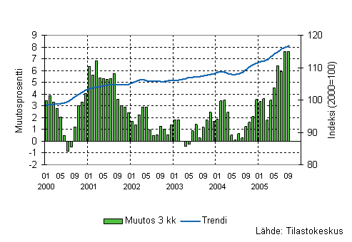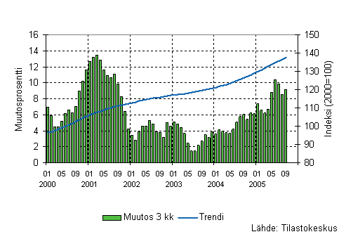 | *) Kolmen kuukauden vuosimuutoksessa verrataan kolmen tilastokuukauden arvoja vuodentakaisten vastinkuukausien arvoihin. | ||||