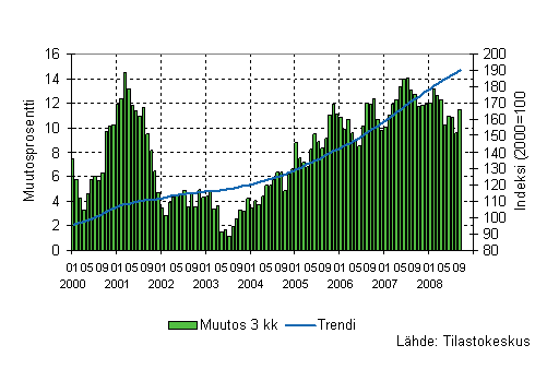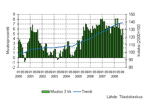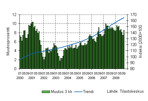 Palvelualojen liikevaihto oli Tilastokeskuksen mukaan vuoden 2008 kolmannella neljänneksellä 8,6 prosenttia suurempi kuin vastaavalla neljänneksellä vuotta aiemmin. Liikevaihdon kasvu pysyi lähes samana kuin kuluvan vuoden toisella neljänneksellä, jolloin kasvua edellisvuoden vastaavaan neljännekseen kertyi 8,8 prosenttia. Palvelualoissa ei ole mukana kaupan toimialoja ja liikevaihto on työpäiväkorjattu poistamalla kalenterista aiheutuvat vaihtelut.