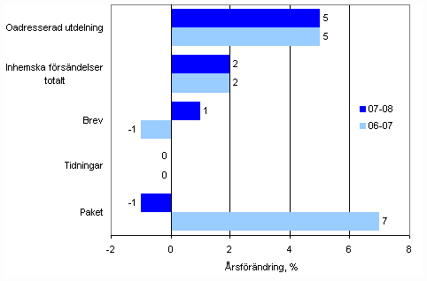 Årsförändring av inhemska försändelser under perioden 2008/2007 och 2007/2006
