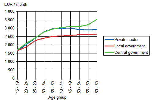 According to Statistics Finland's Structure of Earnings statistics, when comparing the total earnings of full-time wage and salary earners in different employer sectors in 2007, increasing age pushes the level of earnings up the most for the wage and salary earners employed by central government. The level of earnings rises until retirement age also among wage and salary earners in the local government sector, whereas in the private sector wage and salary earners' earnings start to decline after reaching the age of 50.