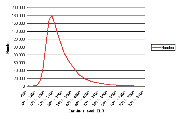 According to Statistics Finland's Structure of Earnings statistics, the average monthly earnings of all full-time wage and salary earners were EUR 2,734 in the last quarter of 2007 and the median earnings1 were EUR 2,428. The earnings of the best paid tenth (9th decile) of wage and salary earners exceeded EUR 4,047 while the lowest paid tenth (1st decile) earned less than EUR 1,748. Thus, the best paid decile earned at least 2.32 times more than the decile with the lowest earnings.