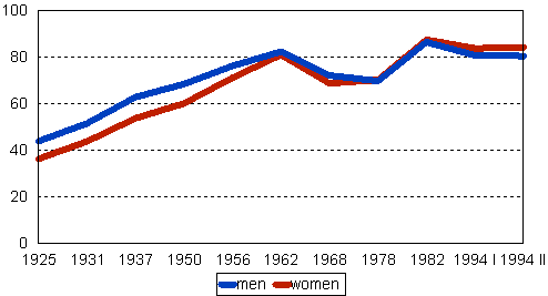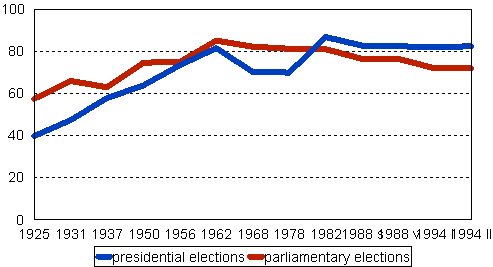 Before World War II, the turnout among women was approximately 10 percentage points lower than among men. Especially in the 1960s women started to assume more active roles in society and caught up with men in the voting turnout figures. In the latest parliamentary and municipal elections women's turnout was higher than men's. In the 1994 presidential election women voted more actively than men in both rounds of the election. In the first round, women's turnout was 80.6 per cent and the difference between the genders in the turnout was 3.0 per cent. In the second round of voting, the difference between women and men in the turnout was 3.8 percentage points.