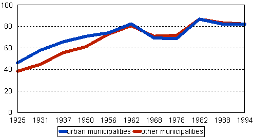 Voting turnout - urban and other municipalities in the 1925-1988 elections of presidential electors and in the first round of the 1994 presidential election