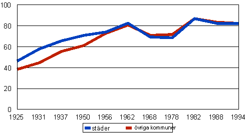 Valdeltagandet - städer och övriga kommuner i elektorsvalen åren 1925-1988 samt under den första omgången i presidentvalet år 1994