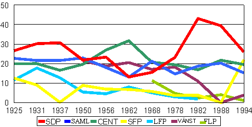 Väljarstödet för de största partierna i elektorsvalen åren 1925-1988 samt i den första omgången i presidentvalet år 1994