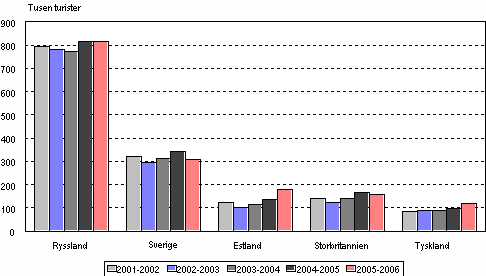 Under vintersäsongen - perioden mellan november 2005 och april 2006 - besökte sammanlagt drygt två miljoner utländska turister Finland. Antalet turister ökade med fyra procent från föregående vintersäsong. Det största antalet turister kom från Ryssland, Sverige och Estland. Antalet besökare från Estland steg med en tredjedel från föregående vintersäsong. Under vintersäsongen kom det fler turister från Storbritannien än från Tyskland. Uppgifterna framgår av gränsintervjuundersökningen, som görs av Statistikcentralen och Centralen för turistfrämjande. Under undersökningsperioden intervjuades totalt omkring 13 300 utländska turister vid Finlands livligaste gränsövergångsställen.