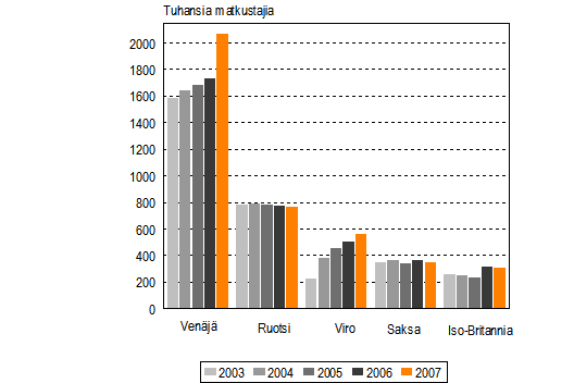 Suomessa vieraili vuonna 2007 noin 5,7 miljoonaa ulkomaista matkustajaa, matkustajamäärä oli 7 prosenttia edellisvuotta suurempi. Eniten, 2 miljoonaa matkustajaa, Suomeen saapui Venäjältä. Venäjältä tulleita oli 19 prosenttia edellisvuotta enemmän. Rahaa ulkomaiset matkustajat toivat Suomeen kaikkiaan noin 1,6 miljardia euroa, 9 prosenttia edellisvuotta enemmän. Eniten rahaa, lähes 40 prosenttia kokonaiskulutuksesta, käytettiin ostoksiin. Tiedot käyvät ilmi Tilastokeskuksen ja Matkailun edistämiskeskuksen vuoden 2007 Rajahaastattelututkimuksesta, jossa haastateltiin noin 40 200 Suomesta poistuvaa ulkomaista matkustajaa Suomen vilkkaimmissa rajanylityspisteissä.