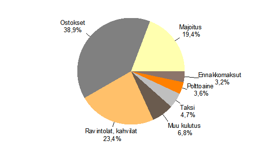 Suomessa työmatkalla oli ulkomaisista matkustajista 29 prosenttia ja vapaa-ajan matkalla 40 prosenttia. Tuttavien tai sukulaisten luona vieraili 12 prosenttia matkustajista. Työmatkalla olleet jättivät Suomeen rahaa 682 miljoonaa euroa, vapaa-ajan matkustajat 585 miljoonaa euroa ja tuttavien tai sukulaisten luona vierailleet 183 miljoonaa euroa. Työmatkalaisten kulutuksesta kolmannes meni majoitukseen, neljännes ravintoloihin ja viidennes ostoksiin. Vapaa-ajanmatkustajat taas käyttivät jopa puolet kulutuksestaan ostoksiin, viidenneksen ravintoloihin ja kahviloihin sekä kymmenesosan majoitukseen.