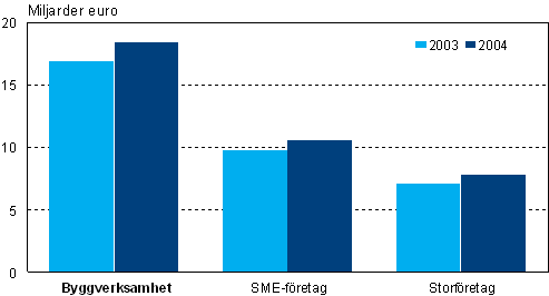 Enligt Statistikcentralens bokslutsuppgifter för år 2004 uppgick omsättningen inom byggverksamheten till 18,4 miljarder euro, dvs. 1,5 miljarder euro mer än år 2003. Omsättningen ökade med 8,9 procent. När man ser till storleksklasser uppgick byggverksamheten inom sektorn små och medelstora företag till 10,6 miljarder euro, dvs. en ökning på 8,1 procent. Storföretagens totala omsättning uppgick till 7,8 miljarder euro, dvs. en ökning på 9,9 procent.