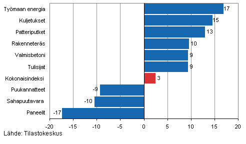 Rakennuskustannusten osatekijöistä eniten nousivat työmaan energian (17 %), kuljetusten (15 %), patteriputkien (13 %), rakenneteräksen (10 %), valmisbetonin (9 %) sekä tulisijojen (9 %) hinnat.
