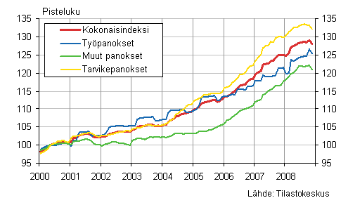 Rakennuskustannukset kohosivat vuoden 2007 marraskuusta tämän vuoden marraskuuhun 2,5 prosenttia. Rakentamisen työkustannukset nousivat vuodessa 3,3 prosenttia, rakennustarvikkeiden hinnat 1,7 prosenttia ja muiden kustannusten hinnat 3,6 prosenttia. Rakennuskustannusten nousuvauhti on hidastunut selvästi tänä vuonna.