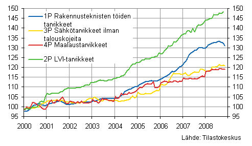 Rakennuskustannusindeksin tarvikeryhmittäisistä osa-indekseistä vuoden aikana ovat nousseet eniten LVI-tarvikkeiden hinnat 5,0 prosenttia. Rakennusteknisten töiden tarvikkeiden hinnat nousivat vuodessa 0,9 prosenttia, sähkötarvikkeiden hinnat (ilman talouskojeita) 1,6 prosenttia ja maalaustarvikkeiden hinnat 3,1 prosenttia. Lokakuusta marraskuuhun rakennusteknisten töiden tarvikkeiden hinnat laskivat 1,1 prosenttia, sähkötarvikkeiden (ilman talouskojeita) hinnat 0,3 prosenttia ja maalaustarvikkeiden hinnat 0,1 prosenttia. Sen sijaan LVI-tarvikkeiden hinnat nousivat 0,7 prosenttia
